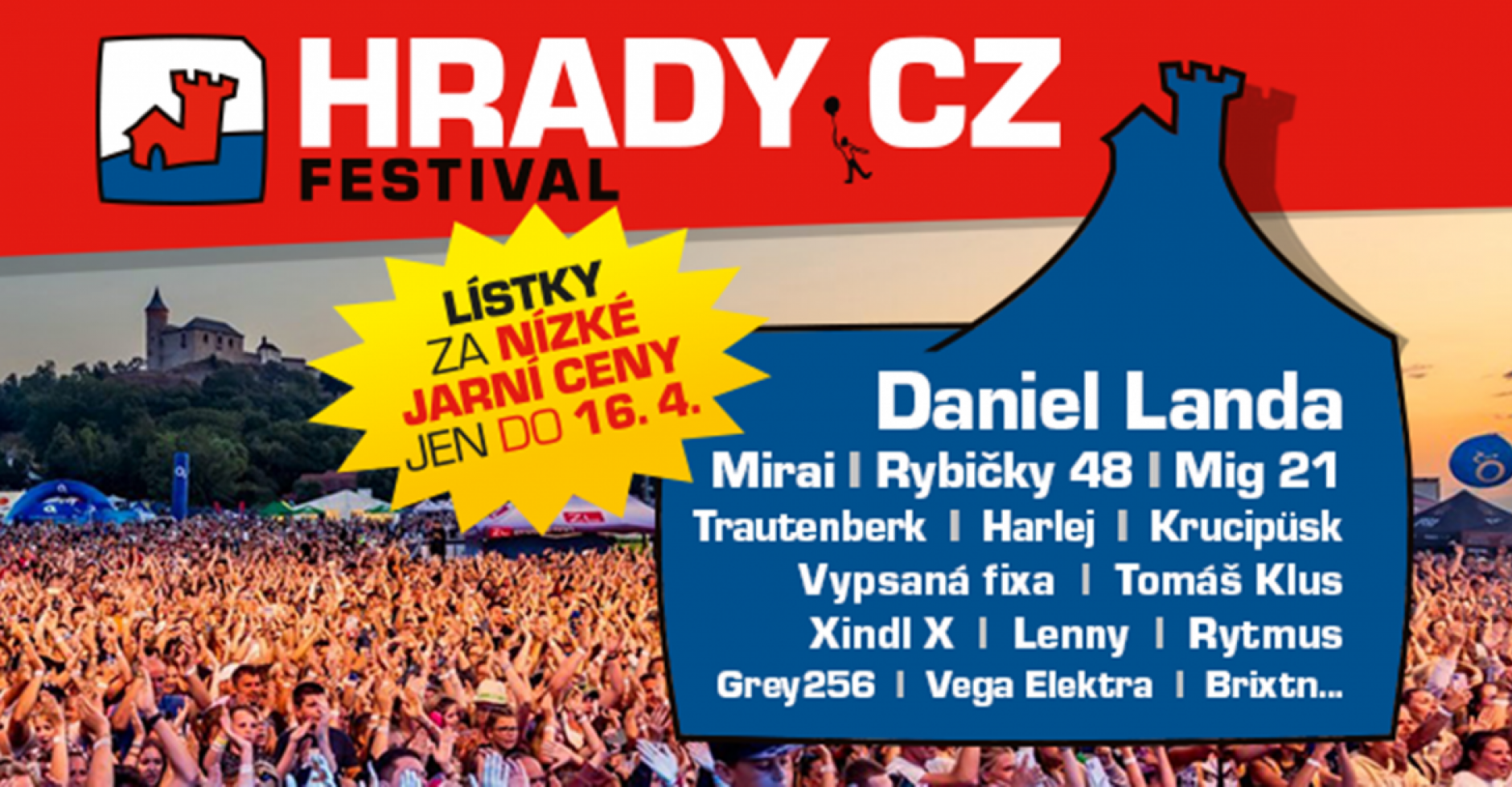 Hrady CZ jako jediný festival svého druhu od počátku svého vzniku spojují zážitek z hudby s podporou turismu a historických památek, součástí sobotní vstupenky je možnost vstupu na hrad či zámek zdarma.Do 16. dubna je možné vstupenky koupit za nízké jarní ceny přímo na stránkách festivalu www.hradycz.cz/vstupenky.